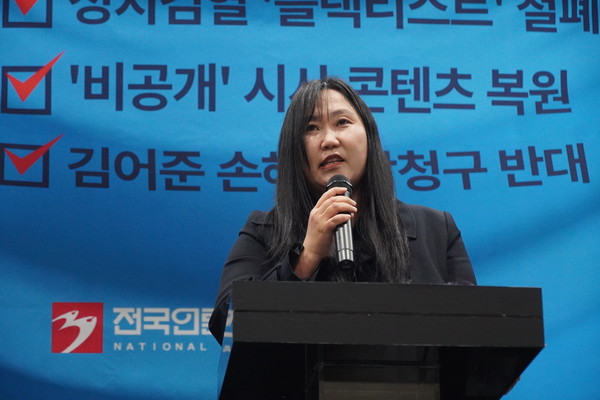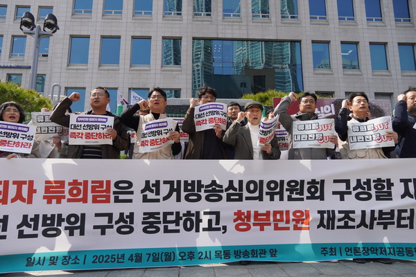 ■ 7일 언론장악저지공동행동은 류희림 방심위원장의 조기 대선 선방심위 구성을 규탄하는 기자회견을 열었습니다. 류희림 방심위원장은 지난 22대 총선 선방위를 통해 정권에 비판적인 언론사들만을 골라 유례 없이 많은 법정제재를 의결하며 편파심의, 정치심의 논란을 샀습니다. 지난 10일엔 법원이 22대 총선 선방심위가 MBC 라디오 ‘신장식의 뉴스하이킥’에 내린 중징계 처분 취소 소송에서 MBC의 손을 들어주기도 했습니다. 이날 기자회견에 참석한 이호찬 언론노조 위원장은 “윤석열 정권 언론장악, 언론 내란 세력의 핵심인 류희림 방심위원장이 선거 방송의 공정성, 객관성을 심의한다는 건 말이 되지 않는다”며 “조기 대선 선방심위 구성은 류희림 위원장 퇴진 이후에 해도 늦지 않는다”고 덧붙였습니다.