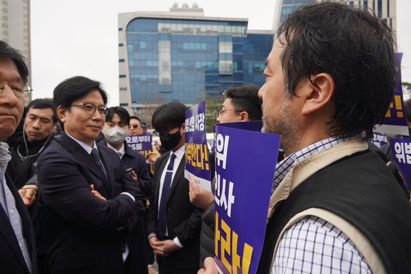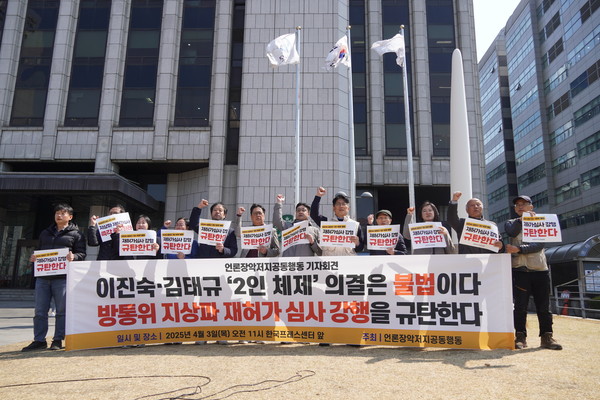 ■ 언론장악저지공동행동은 지난 3일 기자회견을 열고 불법 2인 체제 방통위의 지상파 재허가 심사 강행을 규탄했습니다. 이미 법원은 이진숙 방통위원장이 주도하는 2인 체제 방통위의 의결이 위법하다는 판단을 몇 차례 내놓았습니다. MBC 대주주 방문진 이사 선임 효력 정지는 대법원에서 확정 판결이 이뤄졌고, 최근엔 이진숙 방통위가 임명한 신동호 EBS 사장에 대한 EBS 사장 임명 집행정지 신청이 인용되기도 했습니다. 하지만 이진숙 방통위원장은 잇따른 법원의 판단에도 불구하고 MBC 등 지상파 방송의 재허가를 강행했습니다. 이날 기자회견 참석자들은 “이진숙은 업무 복귀 직후 ‘지상파 재허가와 재승인 심사’를 최우선 과제로 내세우며, 공영방송 압박 의도를 노골적으로 드러냈다”며 “권력에 대한 정당한 감시와 비판을 ‘편향성’으로 몰아 재허가 심사를 공영방송 압박의 수단으로 활용하려는 야욕을 멈추라”고 지적했습니다.