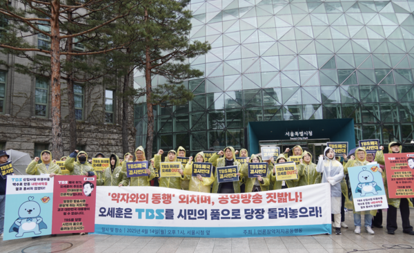 ■ 14일 언론장악저지공동행동은 공영방송 TBS를 파괴하는 오세훈 서울시장을 규탄하고 TBS의 폐국을 저지하기 위한 기자회견을 열었습니다. 대선 출마를 공언했던 오세훈 서울시장은 지난 12일 돌연 보수 정치 재건, 약자와의 동행 등을 운운하며 불출마 선언을 했습니다. 하지만 TBS가 폐국 위기에 놓이는 과정을 수수방관해 TBS 노동자들이 생존권을 위협받는 현실을 초래한 오세훈 시장은 ‘약자와의 동행’이나 ‘보수 정치 재건’을 입에 올릴 자격이 없습니다. 이날 기자회견에서 이호찬 언론노조 위원장은 “22년 지방선거에서 오세훈에게 투표한 서울시민 그 누구도 TBS의 폐국을 예상하지 못했다는 점에서 이 사태는 대국민 사기극”이라며 “오세훈 시장은 현 TBS 상황에 대해 석고대죄하고 정상화 방안을 마련하라”고 촉구했습니다.