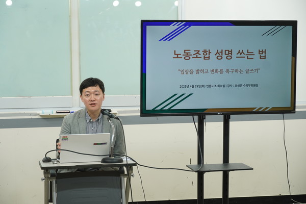 ■ 29일 언론노조는 본부, 지부 조합원들을 대상으로 성명쓰기 교육을 진행했습니다. 성명의 기본 개념과 구조부터 좋은 성명 사례 분석과 효과적인 메시지 전달법까지! 조성은 언론노조 수석부위원장이 강사로 나서 지부의 입장을 선명히 드러내고 독자를 움직일 수 있는 성명 작성법을 알려드렸습니다. 언론노조는 하반기 더 좋은 교육 커리큘럼을 선보일 예정입니다. 이외에도 단체협약읽기교육, 노조활동ABC교육 등 본부·지부를 위한 수시교육이 상시적으로 마련되어 있으니 언제든지 연락주세요.