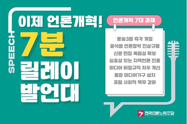 전국언론노동조합(위원장 이호찬)이 5월26일(월)부터 30일(금), 낮 11시30분부터 12시30분까지 국회 1문 앞에서 ‘언론개혁 7대 의제- 7분 이어 말하기’ 투쟁을 전개합니다.