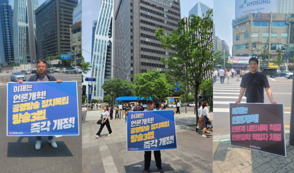 상암에서는 MBC본부와 YTN지부가 점심 피케팅을 나서며 방송3법 개정과 언론장악 책임자 처벌을 촉구했습니다. 어제 총파업에 나선 YTN지부는 YTN 최대주주인 유진그룹 앞에서 규탄 피케팅도 함께 진행했는데요. 조기호 언론노조 SBS본부장님도 피케팅에 함께 해주셨습니다!