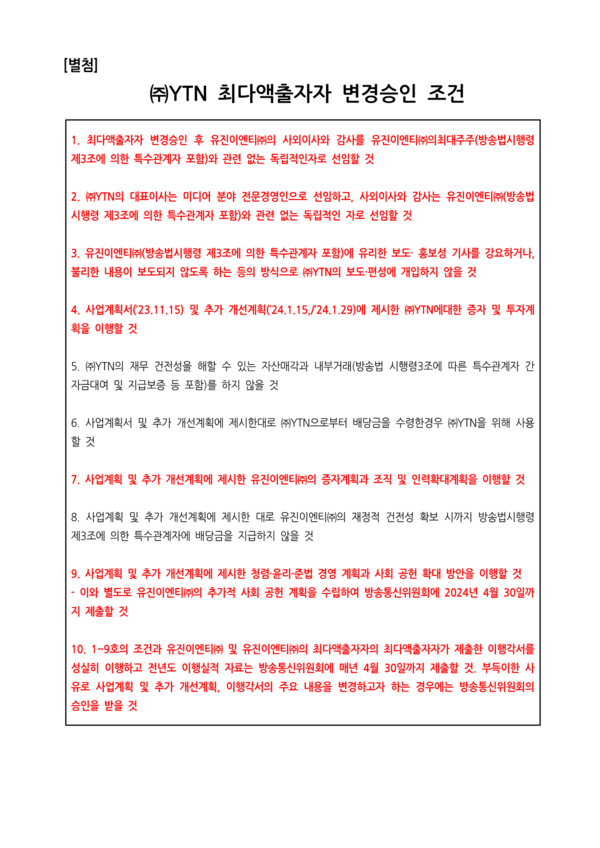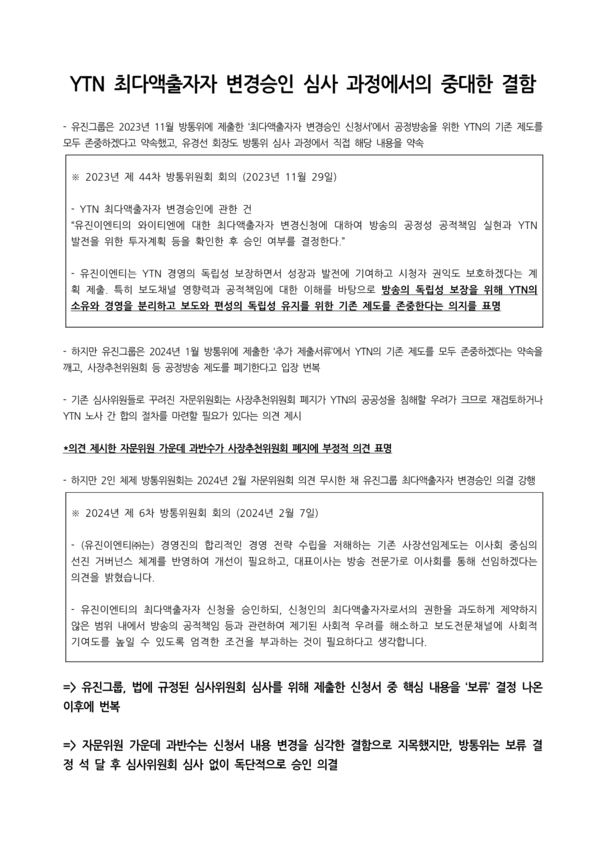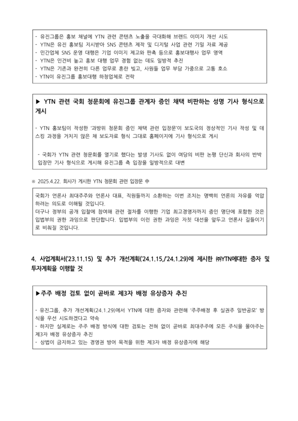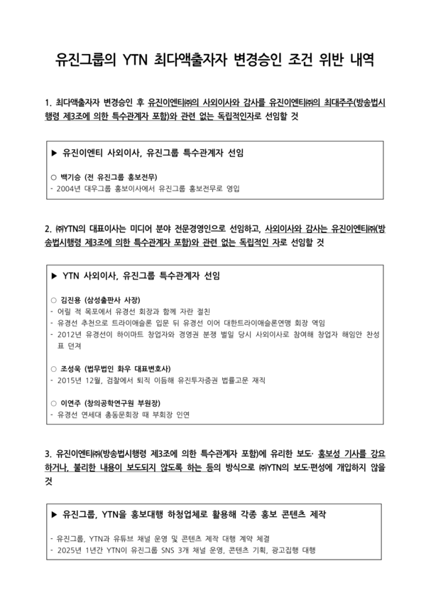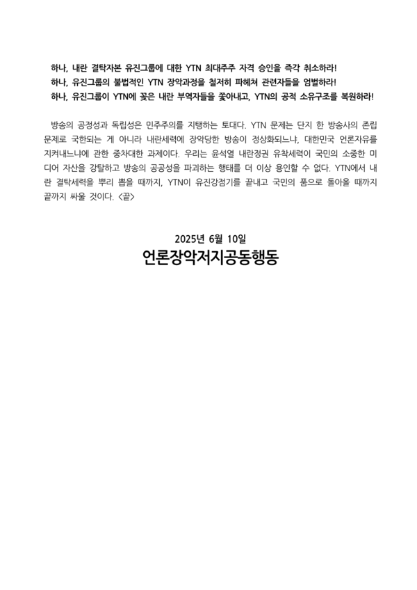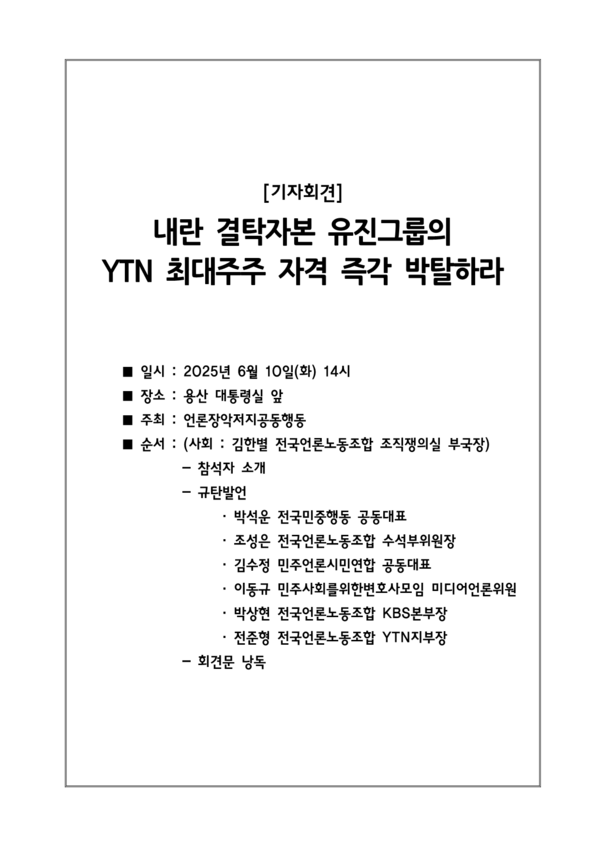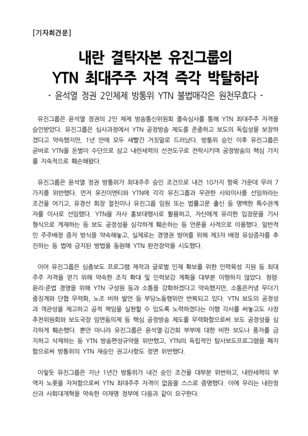 이전 기사보기 다음 기사보기 [보도자료] 내란 결탁자본 유진그룹의 YTN 최대주주 자격 즉각 박탈하라 바로가기 복사하기 본문 글씨 줄이기 본문 글씨 키우기 스크롤 이동 상태바 현재위치 홈 알림 보도자료 [보도자료] 내란 결탁자본 유진그룹의 YTN 최대주주 자격 즉각 박탈하라 기자명 언론노조 입력 2025.06.10 15:35 수정 2025.06.10 15:41 댓글 0 바로가기 복사하기 본문 글씨 줄이기 본문 글씨 키우기 첨부파일 : 기자회견_유진그룹에_대한_YTN_최대주주_자격_박탈_촉구_기자회견_20250610.hwp 언론노조 media@media.nodong.org 다른기사 보기 저작권자 © 전국언론노동조합 무단전재 및 재배포 금지 댓글삭제 삭제한 댓글은 다시 복구할 수 없습니다. 그래도 삭제하시겠습니까? 비밀번호 닫기 기사 댓글 0 댓글 접기 로그인 후 이용 가능합니다. 댓글 내용입력 비회원 로그인 이름 비밀번호 댓글 내용입력 댓글쓰기 계정을 선택하시면 로그인·계정인증을 통해 댓글을 남기실 수 있습니다. 회원 로그인 비회원 글쓰기 이름 비밀번호 자동등록방지 로그인 옵션 창닫기