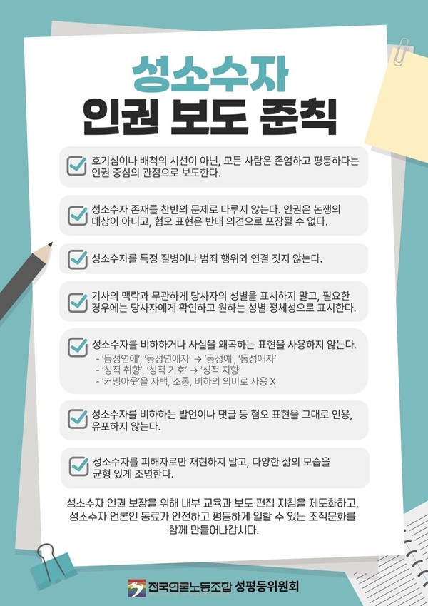 준칙에는 이밖에도 △성소수자를 질병이나 범죄와 연결짓지 않는다 △기사 맥락과 무관하게 당사자의 성별을 표시하지 않고, 필요한 경우 당사자에게 확인하고 원하는 성별 정체성으로 표시한다 △성소수자를 비하·왜곡하는 표현을 사용하지 않는다 △혐오 표현을 그대로 인용, 유포하지 않는다 △성소수자를 피해자로만 재현하지 말고, 다양한 삶의 모습을 균형 있게 조명한다는 조항이 포함됐습니다.