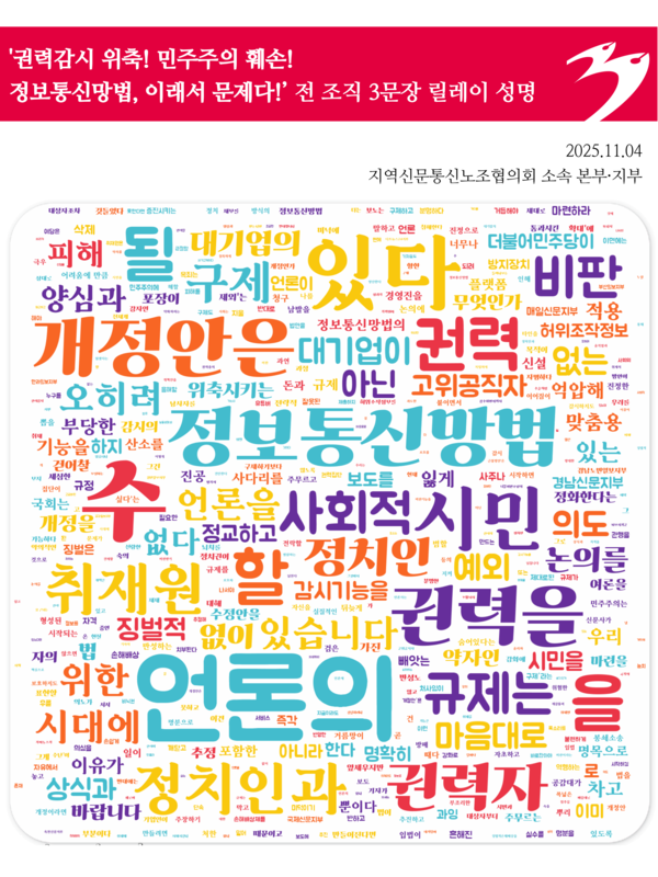 ※ ‘권력감시 위축! 민주주의 훼손! 정보통신망법, 이래서 문제다!’ 언론노조 전 조직 3문장 릴레이 성명 은 3일부터 5일 간 진행될 예정입니다.
