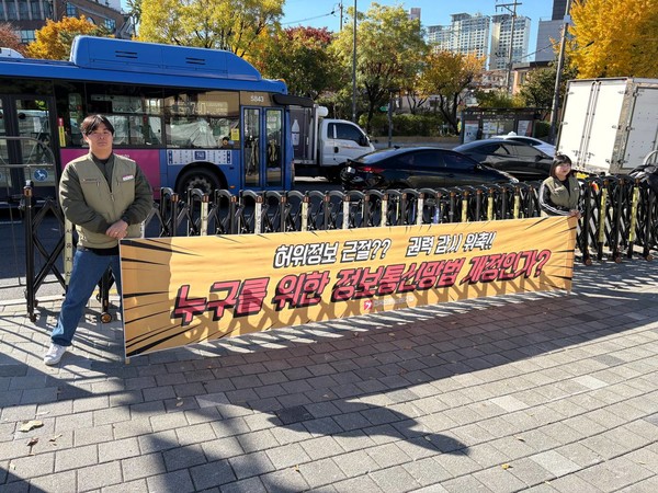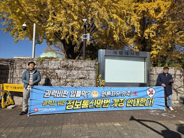 언론노조는 언론의 권력 감시 기능을 위축시키는 정보통신망법 개정안의 문제점을 알리기 위해 현수막·피켓 시위를 진행하고 있습니다. 권력자가 제도를 악용해 비판 언론 탄압에 나설 가능성이 크기에 언론노조는 정보통신망법 개정안 철회를 요구하는 선전전을 이어갈 예정입니다. 더불어민주당 언론개혁특위가 발표한 정보통신망법 개정안의 문제점은 이곳에서 확인하실 수 있습니다.