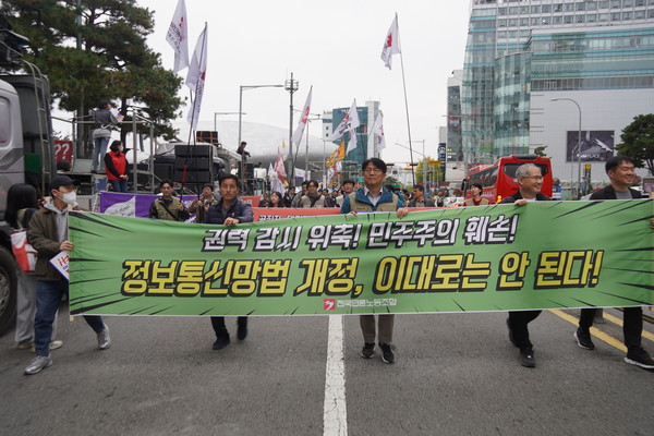 언론노조는 11월 8일 민주노총 전국노동자대회에 참석해 비판 언론에 대한 '입틀막'이 우려되는 현재 정보통신망법 개정안의 문제점을 알리는 선전전에 나섰습니다. 이어진 행진에선 권력자가 징벌적 손해배상제를 악용해 언론을 탄압할 수 없도록 권력자는 징벌적 손배 청구권자에서 제외해야 한다고 촉구하는 현수막을 들었습니다.