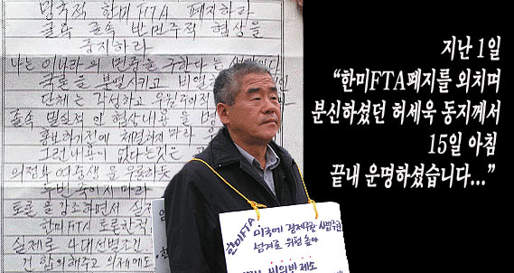 지난 4월 1일 한미FTA 막판 협상이 진행되던 하이야트 호텔 인근에서 협상 중단을 촉구하며 분신했던 허세욱 민주노총 조합원(55)이 15일 오전 11시경 세상을 떠났다.